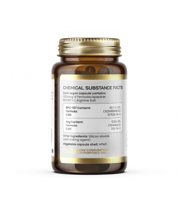 Ozarulab BPC-157 ARG contains 300 mcg of a high-purity synthetic pentadecapeptide (BPC-157) combined with L-Arginine salt in each vegetable capsule. This compound is provided in a convenient, encapsulated format for controlled laboratory and academic research settings.